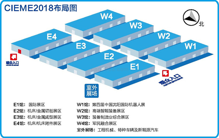 E1馆:国际展区 E2馆:机床|金属切削展区 E3馆:机床|金属成型展区 E4馆:机床及附件展区 W1馆:机器人展区 W2馆:高端智能装备展区 W3馆:装备制造业综合展区 W4馆:军民融合展区 室外展场:工程机械、特种车辆等