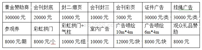 展位收费标准  备注: 1、标准展位基本配置:3m×3m展位(三面围板、一块楣板、一桌两椅、两个射灯、220V电源插座); 2、精标展位基本配备:3m×3m展位(精标展架、布幅广告、地毯、一桌两椅、展位射灯、楣板射灯、220V电源插座); 3、特装展示区:不含任何配套设施,由参展单位自行或委托设计、装修; 技术交流、专题讲座 展会期间主办单位将组织多场技术交流会,以扩大企业技术交流以及经贸合作,各单位均可报名申请举办,请自定交流主题,并与申请表一并传真至组委会。主办单位提供场地、灯光、讲桌、座椅、矿泉水、音响、白板、投影仪等。 收费标准:会议室每场(限3小时)10000元(RMB)。 广告赞助收费标准: 六、2019全年展会预告 2月——济南 2019第14届中国(山东)国际装备制造业博览会 时间:2019年2月26-28日 地点:济南国际会展中心 5月——沧州 2019第3届丞华沧州国际工业自动化及机器人展览会 时间:2019年5月10-12日 地点:河北沧州国际会展中心 5月——青岛 2019青岛国际工业博览会 时间:2019年5月23-25日 地点:青岛世界博览城 9月——济南 2019第23届丞华济南国际工业自动化及机器人展览会 时间:2019年9月 地点:济南国际会展中心