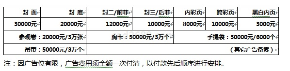 2、光地(不低于36 m²起租);配置:展出场地、保安服务、公共责任保险、无任何设施 国内企业室内光地(36㎡起):¥1700元/㎡ 外资企业室内光地(36㎡起租):¥4000元/㎡ 注 明:1、参展企业若选择双开口展位加20%展位费用。 本届展会提供多种赞助方案,给经营者和供应商提供了更多参与的机会,由此可以最大限度的行有效宣传;如有意企业选赞助,请向组委会索取参与细则。本次展览会80%以上企业为特装,建议预订光地自行搭建。 大会会刊:为了配合展商在展览期间宣传及让客户了解展商并在会后能与之沟通联系,组委会将精心编印大会会刊,会刊规格:145mm×210mm. 大会会刊及其它广告收费标准