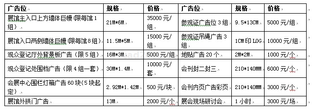 注1:以上报价不包含特装管理费、展具租赁费及额外用电租赁安装费,标准展位转角位另外加收10%。 注2:标准展位为3m×3m,配备:白色围板、一桌、二椅、二灯、中英文楣板、220V电源插座。 注3:馆内净空地36㎡起租,非标准展位不带任何设施,由参展单位自行或委托设计、装修。 注4:展会提供的免费及增值服务:在会刊上登录300字公司简介,宣传报道展会及定向组织观众,参展商胸卡,标准展台搭建(净地除外),展场清洁及保卫,公共照明,展览期间空调,提供会刊两本。 会刊及会场广告: