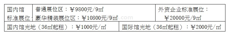 【收费标准】 标准展位9m²(3m×3m);配置:展出场地、三面展板(高2.5m)、一块中英文楣板、一张洽谈桌、二把椅子、地毯、220V电源、二支射灯。双开口位置另外加收10%的参展费用。