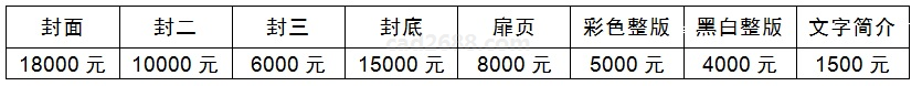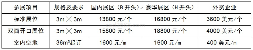 标准展位费用:包括展出场地、2.5m高壁板、楣牌制作、9平方米地毯、洽谈桌一张、椅子二把、5A/220V单相插座一个,射灯二支。 空场地不带任何展架及设施,参展商自行安排特殊装修工作或委托组织单位推荐的搭建公司。 广告刊例 注:会刊规格(210mm * 285mm)、进口铜版纸、版面内容由展商自行设计。