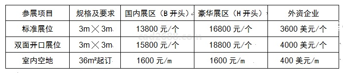 展位配置: 1、标准展位配置包括:每个标准展位三面墙板、二支射灯、一张咨询桌、两把椅子、地毯、220V交流电源插座一只,中英文楣板等。 2、光地展位无任何设施,参展商可自行安排装修工作或委托组织单位推荐的搭建公司。