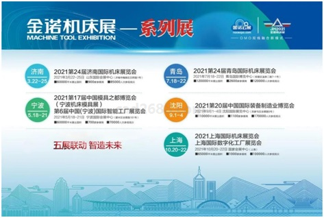中国制造在变,产业格局也在优化。金诺深耕制造业21载,积极打造产业链共享平台,协同创新,从上下游合作到大中小企业融通发展。 第24届济南机床展虽已落幕,金诺机床系列展以需求为导向,接下来让我们相约: 第17届中国模具之都博览会(宁波机床模具展) 第6届中国(宁波)国际智能工厂展览会 时间:5月18-21日 地点:宁波国际会展中心 第24届青岛国际机床展览会 时间:7月18-22日 地点:青岛国际博览中心(即墨区) CIEME第20届中国国际装备制造业博览会 时间:9月1-4日 地点:沈阳国际展览中心 2021上海国际机床展览会 2021上海国际数字化工厂展览会 时间:10月20-22日 地点:国家会展中心(上海)