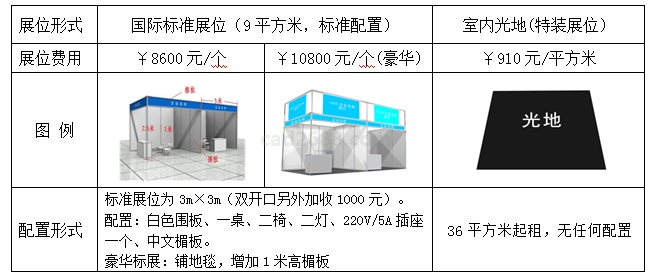 报名参加本届展会,把握与客户面谈沟通的销售机会,投入不大,收益多多。 注1:免费及增值服务包括:会刊(免费刊登300字左右企业简介),参展商胸卡,定向组织观众,标准展台搭建(净地除外),展场清洁及保卫。 注2:参展单位将有关参展费用在报名后按合同约定汇入大会指定账号,并将银行汇款底单传真至承办单位;展位安排以“先申请、先付款、先分配”为原则;如未按合同约定按时付款者,所定展位主办方不予保留。 注3:会前两个月将展商信息发邮件或QQ至组委会,以便组委会及时将您的展品推送给用户,提前帮助参展商和买家更好地进行需求匹配。 注4:其他相关免费增值服务可来电咨询组委会或参阅参展手册、与会通知书