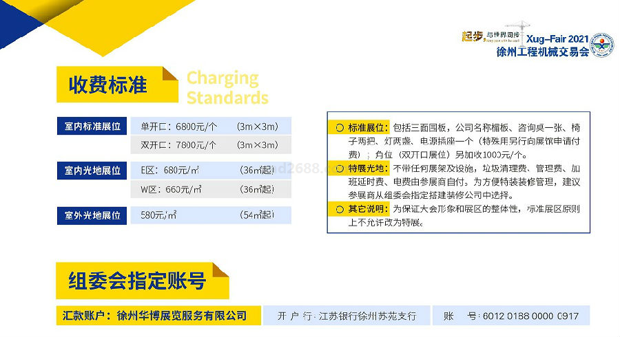 七、联系方式 参展参观请联系:2021徐州工程机械交易会组委会办公室 联系人:杨先生 15351697534(微信同号) 0516-6166 8020 邮箱:xzhuabo888@163.com 地址:江苏徐州市云龙区淮海文博园13号楼3-4层 官方网址:http://xugong-expo.com 采购商、观众参观请联系: 潘小姐 15262001905 0516-8020 2892