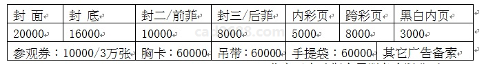 注明:本届展会提供多种赞助方案,给经营者和供应商提供了更多参与的机会,由此可以最大限度的行有效宣传;如有意企业选赞助,请向组委会索取参与细则。会务费:每人1000元人民币。 【大会会刊】 为了配合在展览期间宣传及让客户了解并在会后能与之沟通联系,组委会将精心编印会刊,规格:145mm×210mm.注:广告费用须全额一次付清,以付款先后顺序进行安排。