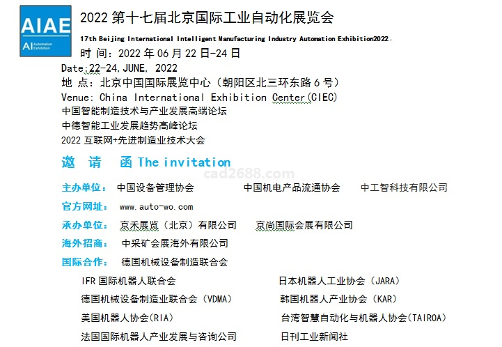 【概况】 北京国际工业自动化展览会创办于2003年、每年在北京举办一届,已成功举办十六届,历经多年来的发展创新,通过专业化、市场化、国际化、品牌化的运作,现已成为国际上工业智能行业具有影响力的品牌展,同时也是我国工业智能装备领域面向全世界的一个重要窗口和经贸交流平台。 “十四五”时期国家正加快形成国内大循环为主体,国际国内双循环相互促进的新发展格局。制造业是实体经济的基础,是构建未来发展战略优势的重要支撑。放眼未来,京津冀地区的工业智能发展将迎来巨大发展,抓住机遇乘势而上这是国际工业智能及自动化展人努力方向。 加快后疫情时代的经济全面复苏,推动传统企业的智能化和数字化转型升级,实现从制造大国向制造强国的转变,同时增强国际与国内、国内企业之间的合作交流。 2022第十七届北京国际工业自动化展览会 (AIAE BEIJING )是专业化的工业智能展会,是全球工业智能品牌进入中国市场的捷径,中国工业智能品牌向世界展示实力的重要窗口,在北京国际工业智能展的平台上汇集了各类工业自动化、工业机器人、智能汽车、VR科技的综合性工业智能自动化产业,是工业智能企业品牌推广和渠道拓展的助推器,传播崭新工业智能市场的重要渠道。 2022第十七届北京国际工业自动化展览会 (AIAE BEIJING)),将于2022年06月22日-24日继续在北京.中国国际展览中心(朝阳区北三环东路6号)举办,欢迎您届时参观参展! 【上届回顾】 2021第十六届北京国际工业自动化展览会展览会于7月7日至9日在中国国际展览中心成功举办。成功吸引了来自全球六十五个国家及地区的近360家企业参展。拥有爱默信中国、中达电通、富士康中国、智动力机器人、精谷智能、高德智感、北京机床研究所、大川重工、中国兵器装备集团、临工智能、东土科技、震坤行工业、尤提乐电气、英冈贸易、橙色云设计、艾默生、SEW、奥地利驻华大使馆商务处、优必胜、力控元通科技等等一大批长期合作的知名展商.展览会共吸引了参观观众68200人次,600余家企业组团参观采购,专业观众达95%,是历届规模大、效果好的一次行业盛会。 【日程安排】 报到布展:2022年06月20日-21日(9—17) 开幕时间:2022年06月22日(9:30) 展出时间:2022年06月22日-24日(9—17) 闭幕时间:2022年06月24日(16) 撤展时间:2022年06月24日(16-21) 【参展范围】 A、智能制造领域的知名企业、关键技术、核心产品等; 工业机器人、高端装备、数控机床、智能制造整体解决方案; B、智能装备、工业机器人 工业机器人及零部件、喷涂机器人、码垛机器人、搬运机器人、装配机器人、激光、焊接机器人、直角坐标机器人、机器人集成应用、整体解决方案、高端数控系统等; C、智能控制系统 控制系统、PLC、SCADA、传感器和执行器、伺服电机、连接器、人机界面、运动伺服、机箱机柜、嵌入式、工业电源、电力电工、电线及电缆附件、电气设备、过程和能源自动化系统; D、机械传动系统 液压、气动、流体传动及元件、机械传动元件及零部件、滑动和滚动轴承、齿轮电机、线性技术以及密封技术; E、机器视觉 智能相机、工业镜头、板卡、配件、光源、软件包、机器视觉集成、机器视觉辅件、工业测量、仪器仪表、流量计、测试和AQI,视觉检测设备; 综合馆:工业机器人 智能汽车 VR科技 工业互联网、工业软件、人工智能、集成电路、物联网、5G等。 【技术交流】 展会期间,展会组委会将协助国内、外参展企业在展馆会议室举办多场技术交流讲座,内容由企业自定,每场专业听众100-160人,由企业自己邀请,组委会协助组织,并于2022年5月1日前将讲座题目、主要内容和主讲人姓名报组委会。技术交流讲座场次有限,报满为止,每场讲座25分钟,费用10000元/场。 【收费标准】 1、 标准展位9m²(3m×3m);配置:展出场地、三面展板(高2.5m)、一块中英文楣板 、一 张洽谈桌、二把椅子、地毯、220V电源插座一个、二支射灯。 (注:双开口展位加收20%)