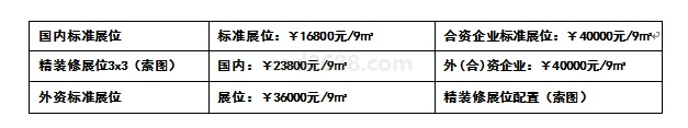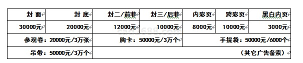 2、光地(不低于36 m²起租);配置:展出场地、保安服务、公共责任保险、无任何设施 国内企业室内光地(36㎡起):¥1700元/㎡ 外资企业室内光地(36㎡起租):¥4000元/㎡ 注 明:1、参展企业若选择双开口展位加20%展位费用。 本届展会提供多种赞助方案,给经营者和供应商提供了更多参与的机会,由此可以最大限度的行有效宣传;如有意企业选赞助,请向组委会索取参与细则。本次展览会80%以上企业为特装,建议预订光地自行搭建。 【大会会刊】 为了配合展商在展览期间宣传及让客户了解展商并在会后能与之沟通联系,组委会将精心编印大会会刊,会刊规格:145mm×210mm. 大会会刊及其它广告收费标准
