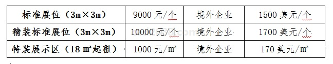 备注:1. 标准展位基本配置:3m×3m展位(包括围板、楣板、一桌两椅、两个射灯、220V电源插座); 2. 精标展位基本配置:3m×3m展位(包括精装标准展台、布幅广告门楣、地毯、一桌两椅、门楣射灯、展位射灯、220V电源插座); 3. 特装展示区:不含任何配套设施,由参展单位自行或委托设计、装修。