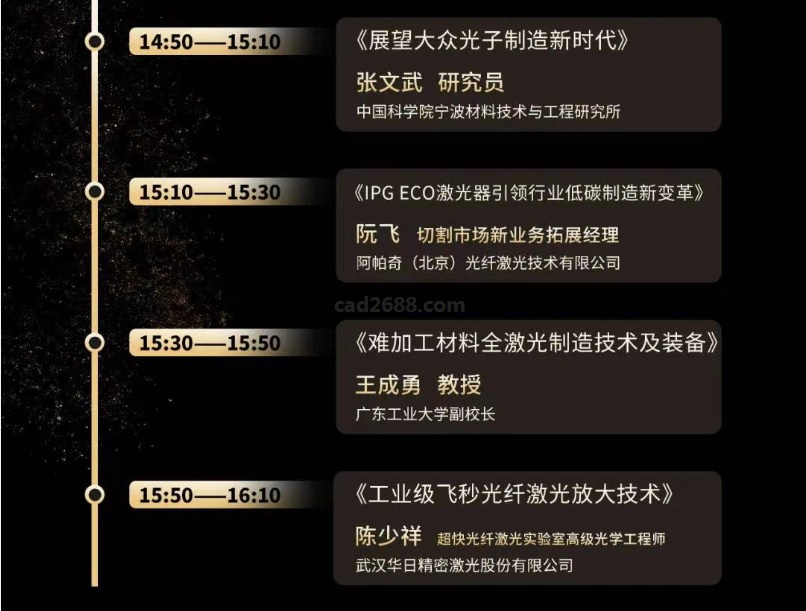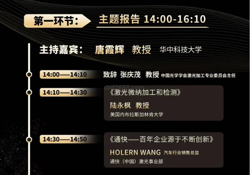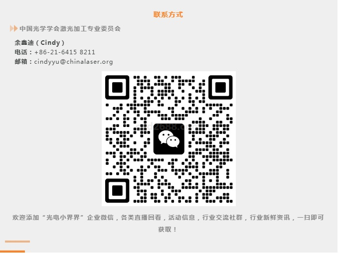 唐霞辉 华中科技大学激光加工国家工程研究中心副主任 张文武 中国科学院宁波材料技术与工程研究所研究员 14:00-14:10 致辞 张庆茂 中国光学学会激光加工专业委员会主任 14:10-16:10 主题报告 16:10-17:00 线上颁奖