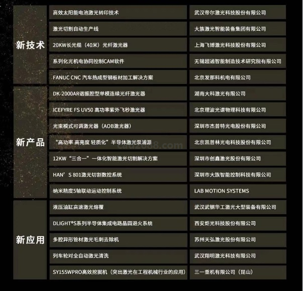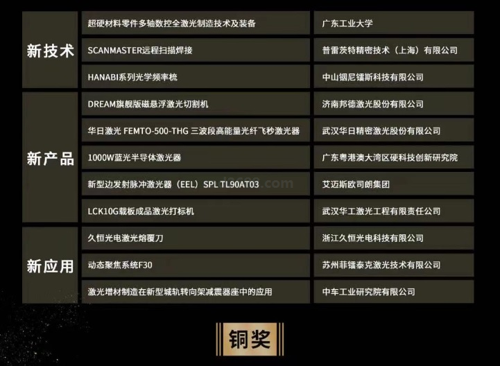 “2022中国激光金耀奖”(Glorious Laser Award,简称:GLA)自4月28日“2022中国激光金耀奖”开启,受到了激光行业及下游应用企业的广泛关注。一个月的报名时间里,组委会共收到67家企业的85项参评产品,相比第一届增加20%。通过网络投票和专家评审组打分,最终评选出35个奖项。从这些参赛的项目中,我们再一次看到激光技术的快速发展和迭代,见证了一批新产品问市和新应用领域的延伸。