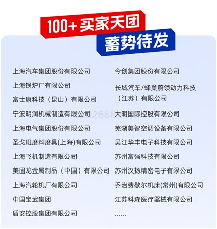100+买家天团蓄势待发 本届展会将全面展示应用于石油化工、航空航天、电子3C、有色金属、环保设备、纺织机械、食品机械、通用机械、仪器仪表、工量刃具、模具制造、家具制品、汽摩配件、电动工具、金属冶炼、物流运输、机械制造、生物科技、新能源新材料、农业机械、机床工具、家用电器、汽车制造、医疗器械等24大行业的新产品、新技术及新解决方案,100+买家天团已整装待发,将组团赴会!