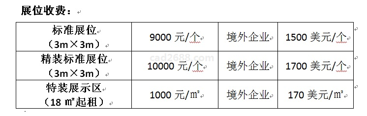 备注 1. 标准展位基本配置:3m×3m展位(包括三面围板、一块楣板、一桌两椅、两个射灯、220V电源插座); 2. 精标展位基本配置:3m×3m展位(包括精装标准展台、布幅广告门楣、地毯、一桌两椅、门楣射灯、展位射灯、220V电源插座); 3. 特装展示区:不含任何配套设施,由参展单位自行或委托设计、装修。