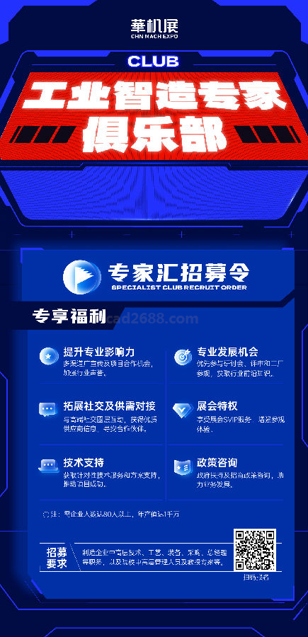 #工业智造专家俱乐部 # 工业发展新载体 转型升级新局面 “工业智造专家俱乐部”旨在助力行业人才库的建设,通过整合全国相关领域专家学者、高端产品制造企业的高管和技术骨干、院校中高层管理人员及教授等专家资源,搭建行业技术进步和“产学研用”协同创新互动交流平台。为企业提供决策咨询和专业服务,共同推进技术创新、应用推广和产业发展。 七大尊享权益 只有福利没有压力 1 40万+私域流量推广 科研团队、项目成果及专家个人将在华机展相关平台(微信公众号、视频号、抖音、微信社群等)宣传推广,拓展项目合作 2 优享行业闭门活动 优先获得参与华机展举办的各类专业行业交流研讨会、奖项评审、年度大型工厂参观名额 3 拓宽高质量社交圈层 受邀参与华机展承接的产业对接会,拓展高端社交圈层,开展多领域交流,提供针对性咨询及资源对接活动 4 SVIP逛展服务 展会期间特享贵宾通道进场参观,现场享有专家顾问休息区、茶歇用餐、私人办公间及采购补贴等 5 定制解决方案 为企业生产制造、技术改造、产线建设、研发等方面的需求,提供针对性的技术服务及方案支持 6 行业资源对接 工业全产业链上下游优质供应商需求对接; 7 最新政策解读 各城市政府扶持及招商政策咨询解读 02 # 报名要求及通道入口 # 聚四方八友 揽天下群英 征集范围 (一) 职级范围: 制造企业中高层技术、工艺、装备、采购、总经理等职务,以及院校中高层管理人员及教授专家等。 (二) 行业范围: 汽车整车及零部件制造;半导体及3C电子制造;模具制造;航空航天;轨道交通;医疗;消费品工业领域(轻工、家电、食品包装、纺织机械);通用机械(泵阀等);工程机械;农业机械;船舶;电气及其他... *注:需企业人数达80人以上,年产值达1千万 专家基本条件 (一) 拥护党的路线方针政策,廉洁自律、遵纪守法,具有良好的政治素质和职业道德,能够客观、公正、实事求是地履行职责; (二) 在本专业领域理论上或实践上有较深造诣; (三) 能积极参与组委会组织的各类专业研讨、活动或评审工作; (四) 为展会提供新技术、新设备以及行业发展趋势等意见和建议。 专家报名渠道 (一) 个人申请