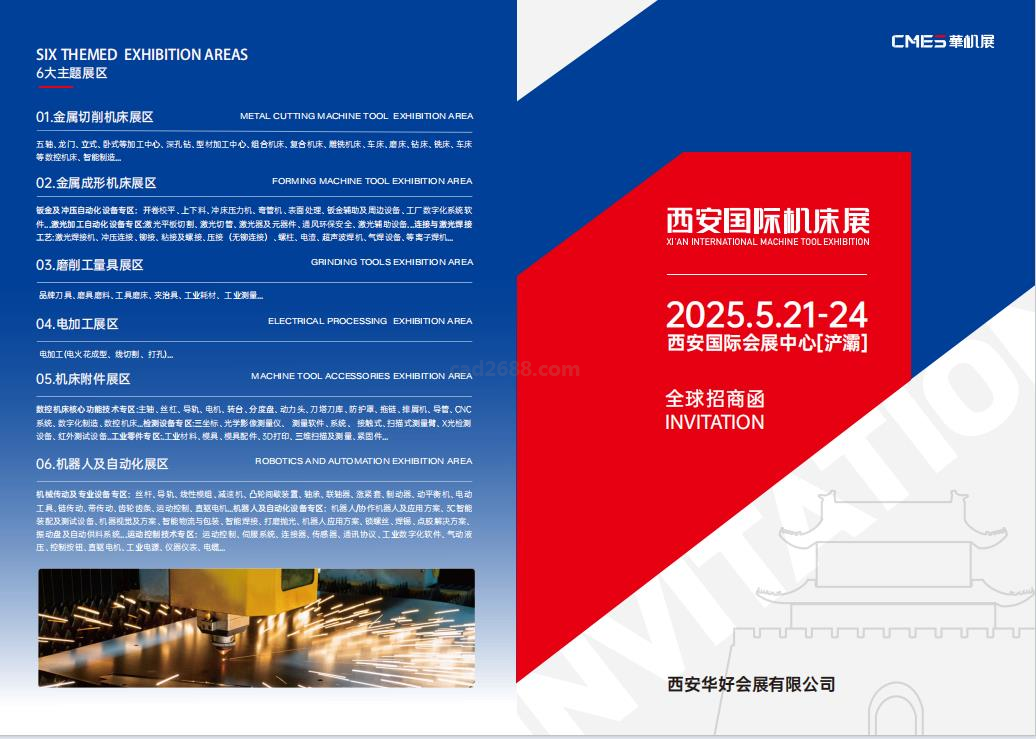 展会信息 展会名称:CMES华机展 | 西安国际机床展 展会时间:2025年6月5-8日 展会地点:西安国际会展中心【浐灞】 展会规模:40,000㎡展览面积 参展品牌:600 + 主办单位:上海华墨展览服务有限公司 承办单位:西安华好会展有限公司 参展费用:光地展位(36㎡起):580元/平㎡ ;普通标展(9㎡):单开6000元/个 展会官网:https://www.expocme.cn/zh/xa 展会介绍 随着“中部崛起”“一带一路”等国家发展战略的实施,西安先进制造业发展成效初显。 作为中国军工大省,北斗、嫦娥、天问、神舟等大国重器、大国工程,均不乏西安制造的身影;中兴、华为、三星,以及腾讯、阿里和 360 等企业纷纷在西安开厂、设立区域中心,西安已形成通信设备、电子元器件、集成电路、智能终端等多个产业集群;此外,西安新能源汽车产业也屡创新绩,于2022年问鼎“中国新能源汽车产量第一城”! “西安制造”被频频聚焦,2025年西安国际机床展谋势而动,特设“金属切削、金属成形、磨削工量具、机床附件、机器人及自动化、电加工”六大主题展区,40000㎡展厅集结600+品牌展商,打造中西部最具影响力的工业会展标杆。 2025年6月5-6月8日,西安国际机床展将在西安国际会展中心(浐灞)重磅举办。