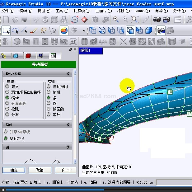 此教程内容包括基本曲面创建(I)-后挡板、基本曲面创建(II)-门板、曲面片的编辑和优化、曲面相交技术的应用四个视频文件,以及对应的原始数据和结果数据。Geomagic10.0曲面创建教学视频截图如下: