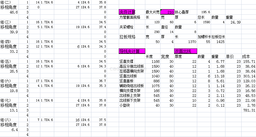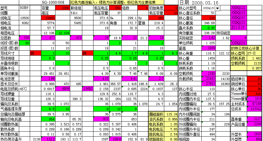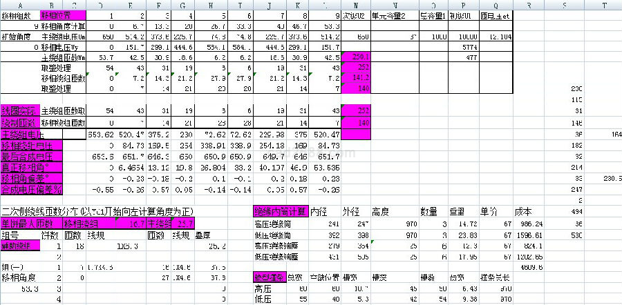 涉到的主要参数有:型号、线圈、线电压、相电压、每匝电压、总匝数、线段数、导线尺寸、导线绝缘、圆角半径、单导线截面、电流密度、匝长及总长、电阻及损耗、导线裸重、导线总重、辐向及系数、气道高撑条厚、轴向及电抗高、线圈散热面、散热系数、有效散热面等等。