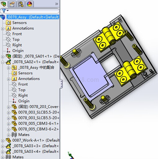 ;动作 夹紧并固定工件(电路板)后进行颠倒的焊接夹具。 环境·操作性 作业步骤 固定工件,并通过磁铁固定盖板。焊接夹具Solidworks模型如下: