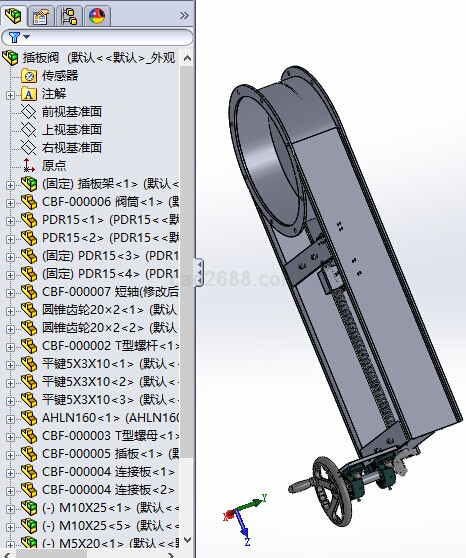 插板阀又称手动刀型闸阀,一种用于管道通断的手动阀,加上电机就可以自动操作。零件及部件都有。插板阀Solidworks模型如下:
