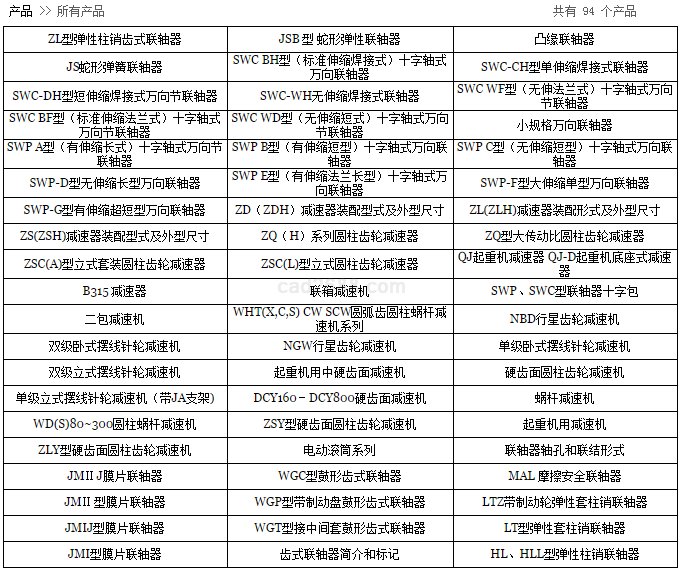 公司的主导产品为减速机和联轴器公司主要生产的产品有SWC型、SWP型、渐开线十字万向轴、CL、CLZ、GIGL、GCLD、GIICLD、NGCL、WG、WGZ、WGT、HL、LZ、LM、SL等各种系列型号的联轴器及圆柱齿轮、摆线针轮、蜗轮蜗杆、软齿面、中硬齿面、硬齿面、三环等十几个品种的减速机。我公司的 产品先后在 全国40多家大中型钢铁企业和配套制造厂中适用,并得到广大的用户好评。