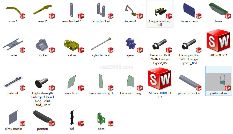 水陆两用挖掘机模型Solidworks格式模型和包括的内容如下: