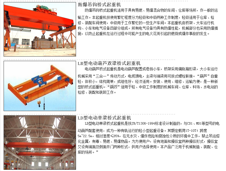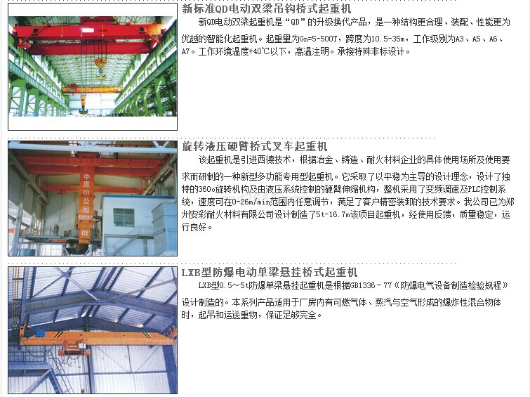 公司重视技术创新,逐步提升产品的科技含量,产品设计开发采用CAD、CAPP辅助设计,公司先后与北京起重运输机械研究所、武汉科技大学等科研院所建立了长期的合作关系,同时密切关注国内外起重产品的尖端技术及发展方向,不断更新设计理念与产品结构,逐步将先进的数字化技术引用到产品制造中,如变频调速技术、PLC控制技术、远程操作技术、自动化信息控制技术等的广泛应用大大拓宽了产品的使用范围,公司还积累了低净空起重机、多功能起重机及各类非标产品的成功制造经验,能满足各领域的不同使用要求。