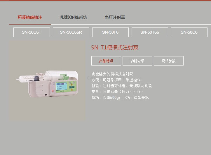 目前,圣诺医疗已自主开发出用于CT/MRI/DSA增强造影成像的SinoPower系列高压注射器产品,用于药液精确注射的SN-50系列微量注射泵产品和输液控制工作站,以及专用于女性乳腺影像诊断的钼靶乳腺X光机等高科技产品。