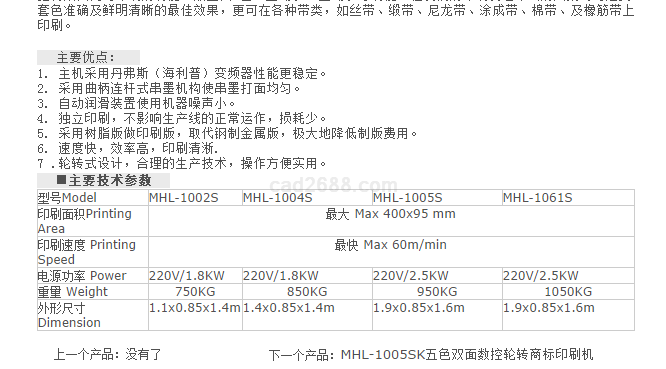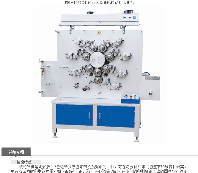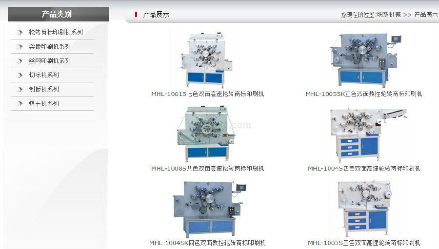 “明辉”牌商标印刷机共分四大系列二十余款产品:卷筒式丝网印刷机、柔性版商标印刷机、高速轮转机、无限尺寸微电脑轮转商标印带机、自动微电脑超声波切断机、微电脑自动商标切带机(冷、热)、微电脑制版机、红外线烘干机、恒温干燥箱等各种商标印刷机及配套设施。产品广泛用于服装商标、吊牌、医药、食品、日化、电子、玩具、礼品、超市条码等各种行业的标签与制作,深受广大用户欢迎和信赖。