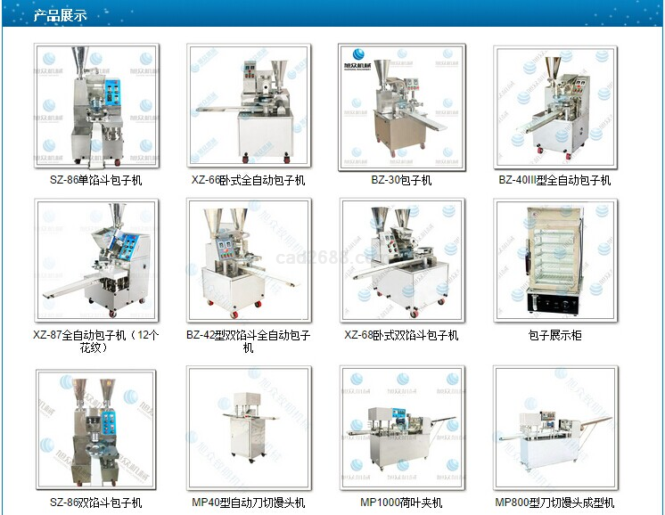多年来,我们长期致力于研制和开发,不断的改进和创新企业的产品。现有产品包括:包子机、包子馒头机、刀切馒头机、馒头机、包心鱼丸机、包陷肉丸机、油压打浆机、斩拌机、油炸机、真空油炸机、河粉机、米粉(米线)机、和面机、包馅汤圆机、饺子机、切菜机、鱼糜设备、刨肉机、绞肉机、切丁机、切片机、月饼机、酥饼机、中药打粉机、烘干箱、制药丸机、各类包装机等系列设备。是国内食品机械最齐全的包子机厂家。