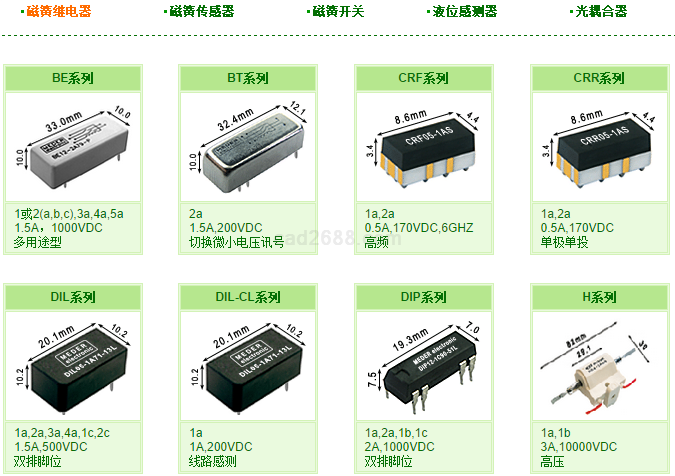 主要经营产品有:磁簧继电器(干簧继电器)、磁簧传感器(接近开关)、磁簧开关(干簧管)、液位感测器、光耦合器、信号继电器、功率继电器、直流大功率继电器、光耦继电器(MOS FET)、高频继电器(同轴开关)、固态继电器、时间继电器、水银继电器、水银接触器、直流接触器、微动开关、轻触开关、拨码开关、DIP开关、DOME开关、船型开关、振动倾斜检测开关、半间距连接器、FPC连接器、DIN连接器、MIL及短路连接器、触摸传感器、MEMS传感器、ASSP模拟IC、IC插座系列、光通信器件等元器件。离心风机、轴流风机、贯流风机、无蜗壳风机、管道风机、屋顶风机、消防风机、排烟风机、离子风机、风机箱系列.