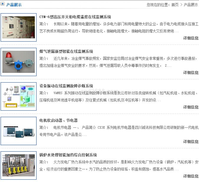 经过十多年的不懈努力,在引进、吸收国外先进技术基础上,公司坚持科技进步、自主创新,自主开发出高压开关柜电缆温度在线监测系统、煤气泄漏新型在线监测系统、设备振动在线监测故障诊断系统、锅炉水处理智能加药综合控制系统、电能质量监控系统、电机软启动器、节电器等系列产品,广泛应用于电力、冶金、交通、石油、化工等领域,赢得了广大用户的普遍认同和赞誉,无论在产品创新还是在市场占有率方面,均取得了十分骄人的成绩。