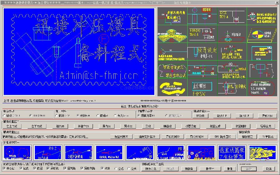 自主开发的用于冲压模具的模板的备料CNC程式的生成,改软件的特点是:基于cad平台二次开发,只要会用AutoCAD就可以在2-3小时内掌握使用,不需要了解G代码。可以根据客人的加工习惯以及标准进行定制。