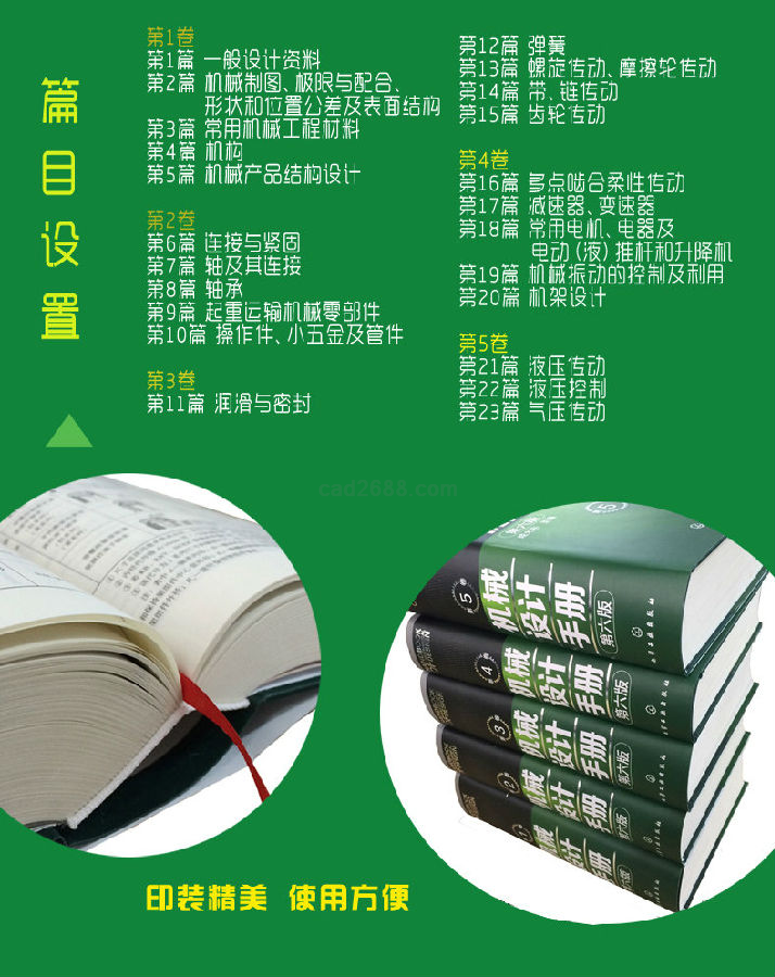 《机械设计手册》第六版共5卷,涵盖了机械常规设计的所有内容。其中第1卷包括一般设计资料,机械制图、极限与配合、形状和位置公差及表面结构,常用机械工程材料,机构,机械产品结构设计;第2卷包括连接与紧固,轴及其连接,轴承,起重运输机械零部件,操作件、小五金及管件;第3卷包括润滑与密封,弹簧,螺旋传动、摩擦轮传动,带、链传动,齿轮传动;第4卷包括多点啮合柔性传动,减速器、变速器,常用电机、电器及电动(液)推杆与升降机,机械振动的控制及利用,机架设计;第5卷包括液压传动,液压控制,气压传动等。