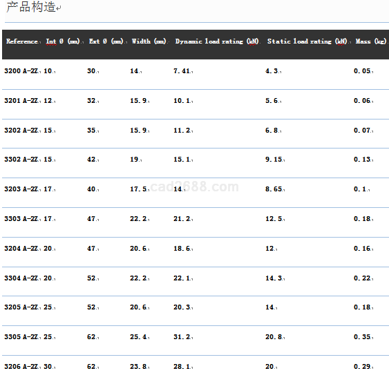 SKF带屏蔽的双列角接触球轴承3D模型IGS格式模型内容及部分结构尺寸表如下: