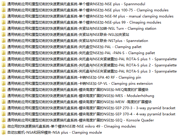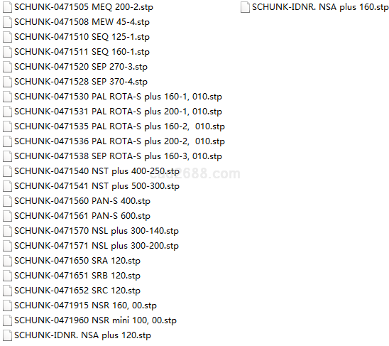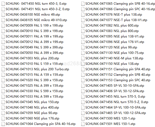 SCHUNK快速更换托盘系统3D模型包括Solidworks(用Solidworks2013及以上版本可以打开编辑)、STP、IGS格式,模型数量为1040个,包括了SCHUNK雄克所有系列的加工中心用快速更换托盘系统类别