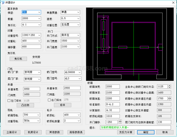 10.机房设计,在软件界面中点击机房设计,会弹出机房数据选择界面,可以根据需要选择小机房或大机房、限速器、机房门、控制柜等内容。机房设计在界面中也是动态展示的,在修改不同的参数时,图纸展示区会自动变化,展示控制柜、机房门的位置。
