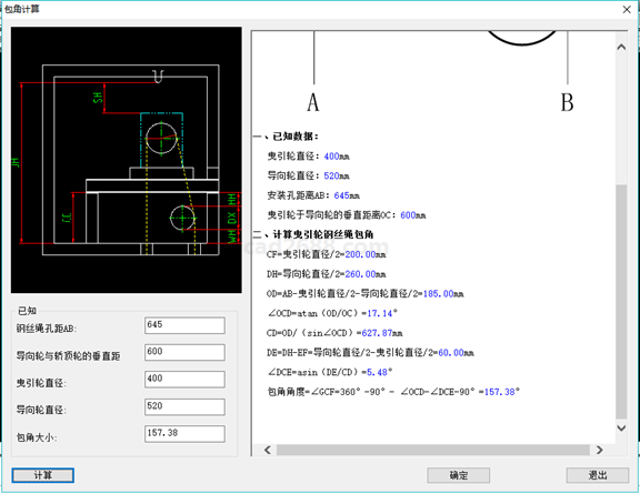 9. 计算包角,软件系统根据曳引轮直径、导向轮直径、安装孔距离、曳引轮于导向轮的垂直距离来计算曳引轮钢丝绳包角数值。
