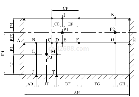 11.根据已知数据曳引机自重、电梯载重、轿厢重量、对重重量、其他重量、载重系数、平衡系数来计算出承重梁受力计算数值,同时分别计算出C点和F点的弯矩,计算F点处的应力,承重梁刚度(变形)计算值。
