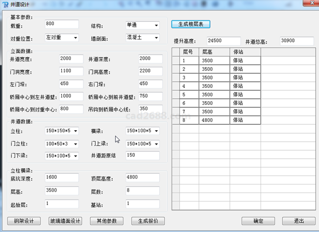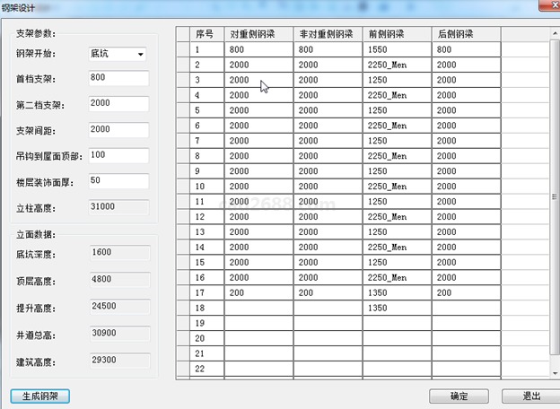 5. 钢架设计参数的选择,如钢架起始位置、首档支架、第二档支架、支架间距、吊钩到屋面顶部距离、楼层装饰面厚等参数,同时计算出立柱高度、底坑深度、顶层高度、提升高度、井道总高、建筑高度等值,并生成钢架数据表,如下图: