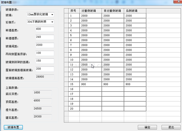6. 玻璃墙面参数设计,在这里可以完成玻璃材质型号、驳接爪材质标准、砖墙高度、砖墙厚度、玻璃间距、吊钩到屋面顶部、玻璃到钢架的距离、屋面玻璃距墙面玻璃等值的选择输入,同时完成玻璃墙面高度、底坑深度、顶层高度、提升高度、建筑高度的计算,生产玻璃布置数据表,如下图: