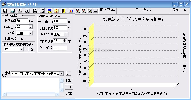电缆计算软件适用于设计院配电设计,有了它再也不用为开关、电缆、压降、长度和单相灵敏度校验等烦恼,试试吧!绝不会后悔。软件周时置有校正系数选择框和电缆数据列表框LIB\VV22四芯不等铜电缆.TXT 电缆数据库文件...