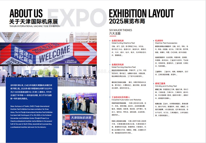 展会信息 展会名称:CMES华机展 | 天津国际机床展 展会时间:2025年9月17-20日 展会地点:国家会展中心(天津)二期 展会规模:50,000㎡展览面积 参展品牌:700 + 主办单位:上海华墨展览服务有限公司 承办单位:天津华好会展有限公司 参展费用:光地展位(36㎡起):880元/平㎡ ;普通标展(9㎡):8800元/个 展会官网:https://www.expocme.cn/zh/tj 展会介绍 河海交汇,天工开埠。作为我国近代工业发祥地之一,天津的血脉里流淌着制造业基因。 向制造高地飞跃,是天津经济高质量发展的战略选择。立足“全国先进制造研发基地”的定位,天津正着力构建新型产业矩阵,加快培育现代产业体系,在数字化转型赛道上争先进位、勇往直前。 2025年天津国际机床展,以50000㎡展览规模,聚焦金属切削机床、金属成形机床、工业自动化及机器人、磨削工量具、机床附件、电加工六大产业集群,全方位展示机床上下游产业链的核心技术和前端产品,引领制造业同僚竞逐新赛道。