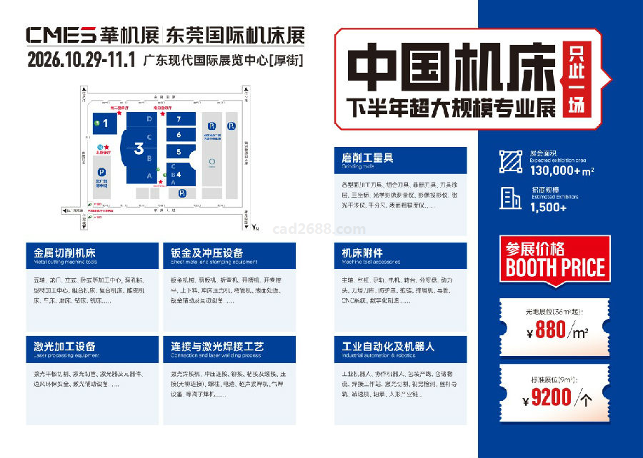 展会信息 展会名称:CMES华机展 | 东莞国际机床展 同期举办:CMES华机展 | 东莞国际工业自动化及机器人展 展会时间:2026年10月29-11月01日 展会地点:广东现代国际展览中心(东莞厚街) 主办单位:东莞华墨展览服务有限公司 展会规模:130000㎡展览面积,1500+参展品牌 展会费用:光地展位(36㎡起):980元/㎡ ,标准展位(9㎡):9200元/个 展会官网:https://www.expocme.cn/zh/dg 展会介绍 新一轮科技革命与产业变革浪潮当下,科技创新、产业升级正在重塑全球经济格局。 “以制造业当家”的东莞,已是世界上最大的制造业基地之一,拥有电子信息万亿产业集群。其⾼端制造业的产业集群效应,为中国乃至全球的制造业发展做出了重要贡献。 华机展持续深耕工业机械领域,积极布局华南市场。2026年10月29-11月1日,依托东莞制造业及工业会展的优越基础,“华机展·东莞”将在广东现代国际展览中心[厚街]重磅举办。 本届华机展·东莞以“应用聚焦,震撼华南”为主题,130000㎡展览规模吸引1500+知名品牌同场竞技,为“东莞制造”到“东莞智造”的蝶变之路注入新动力。