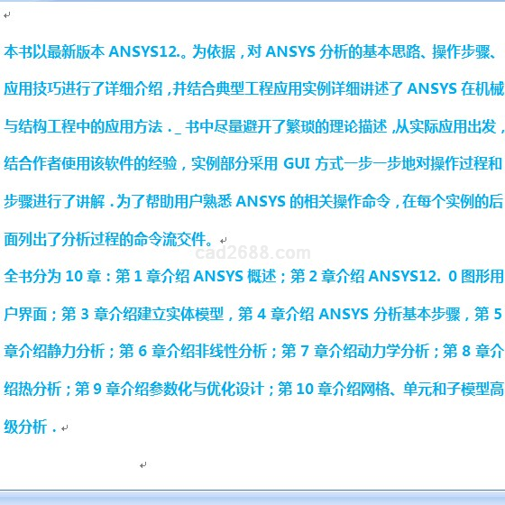 全书分为10章:第1章介绍ANSYS概述;第2章介绍ANSYS12. 0图形用户界面;第3章介绍建立实体模型,第4章介绍ANSYS分析基本步骤,第5章介绍静力分析;第6章介绍非线性分析;第7章介绍动力学分析;第8章介绍热分析;第9章介绍参数化与优化设计;第10章介绍网格、单元和子模型高级分析.