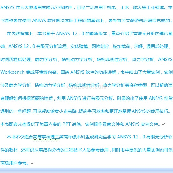 本书不仅适合高等擎校理工类高年级本科生或研究生学习ANSYS 12.0有限元分析软件的教材,还可供从事结构分析的工程技术人员参考使用,同时书中提供的大量实例也可供高级用户参考。