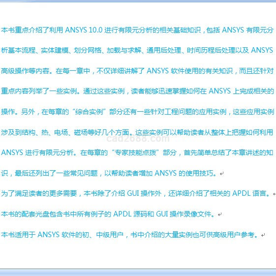 本书适用于ANSYS软件的初、中级用户,书中介绍的大量实例也可供高级用户参考。