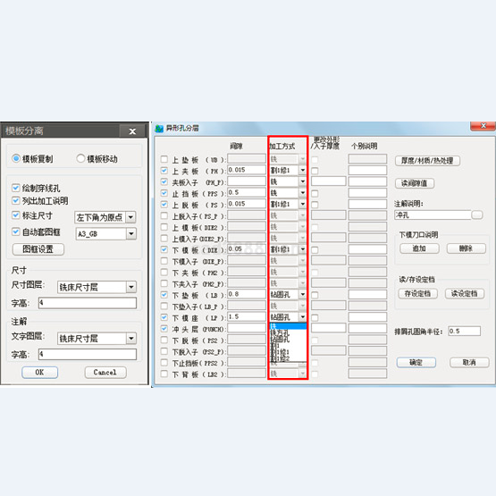 模具总装图绘制完成后,可自动拆分出模板图,绘制穿孔、列出加工说明、标注模板尺寸、以及自动套图框。