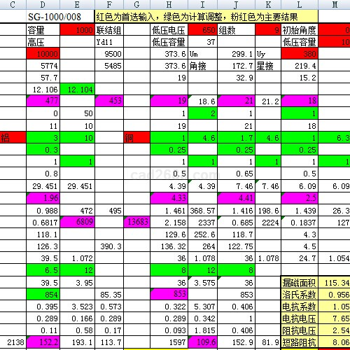 涉到的主要参数有:型号、线圈、线电压、相电压、每匝电压、总匝数、线段数、导线尺寸、导线绝缘、圆角半径、单导线截面、电流密度、匝长及总长、电阻及损耗、导线裸重、导线总重、辐向及系数、气道高撑条厚、轴向及电抗高、线圈散热面、散热系数、有效散热面等等。