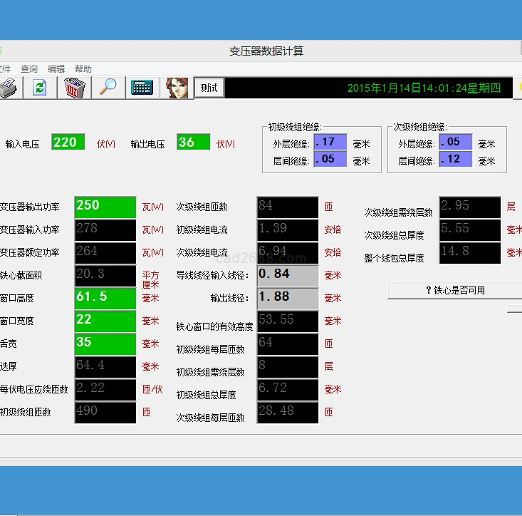 工具中设计到的参数主要有输入输出电压、变压器输出功率、变压器输入功率、变压器额定功率、铁心截面积、窗口高度及宽度、舌宽迭厚、每伏电压应绕匝数、导线线径输入线径等。
